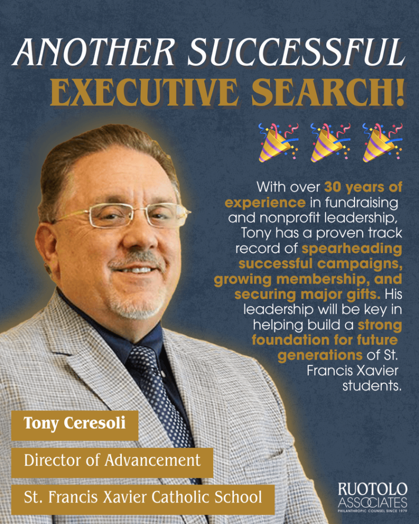 Ruotolo Associates and St Francis Xavier Catholic School are thrilled to announce that Tony Ceresoli has joined the School as the new Director of Advancement! With over 30 years of experience in fundraising and nonprofit leadership, Tony is a true superstar. Tony is recognized for his mentor-style and solution-focused approach, as well as his ability to inspire and empower teams. We know his efforts in growing a vibrant Advancement and Alumni Relations program will be invaluable for the future at St. Francis Xavier. Congratulations Tony!